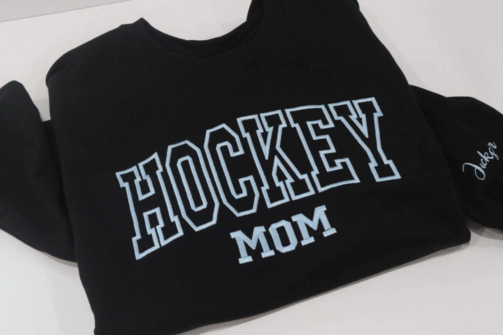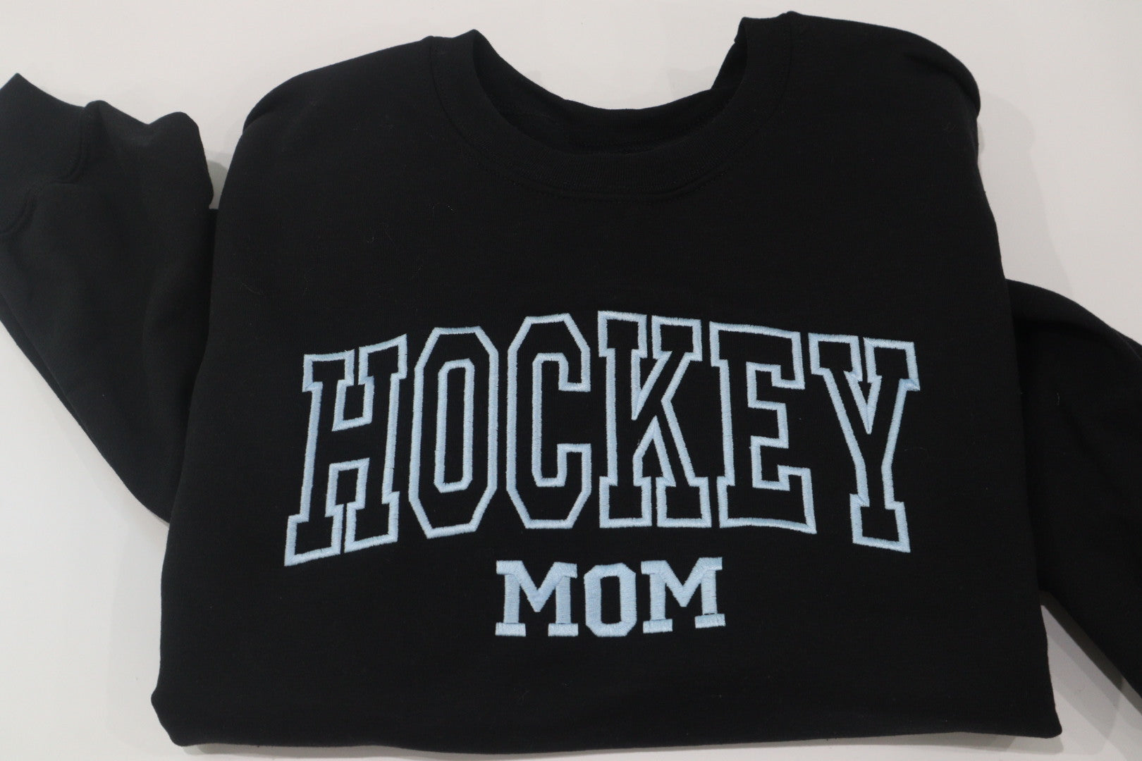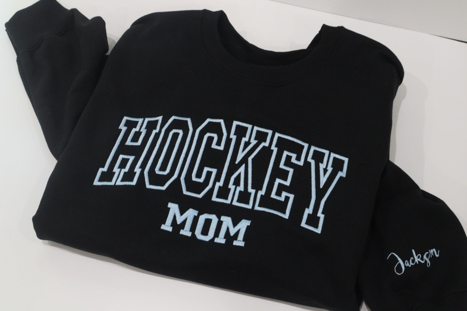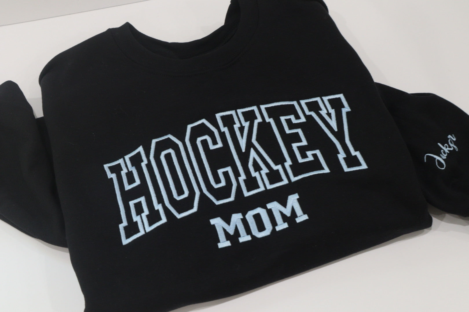 Black crewneck with baby blue thread unless specified, can pick any thread color!