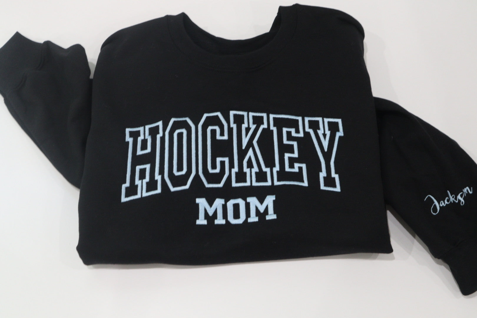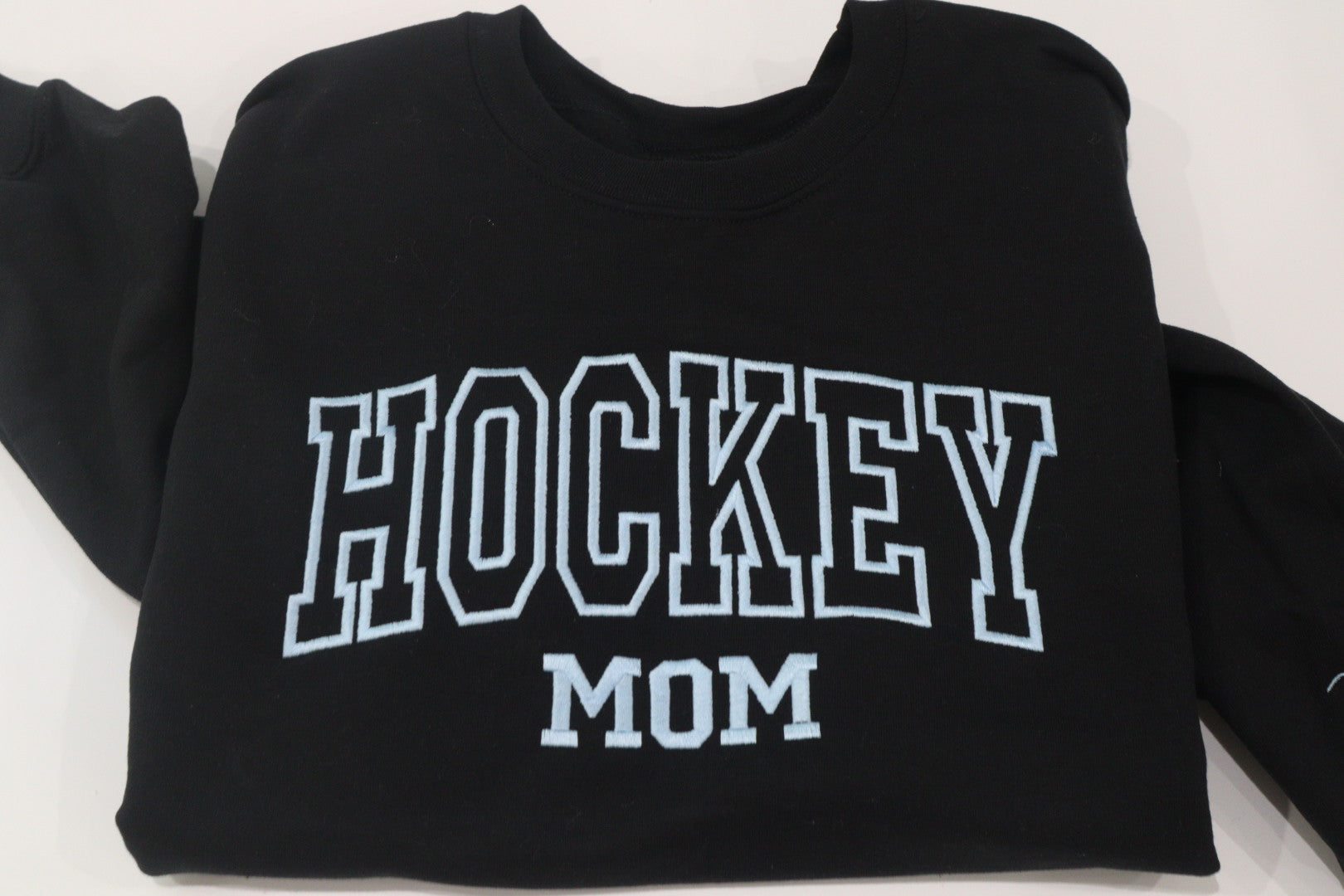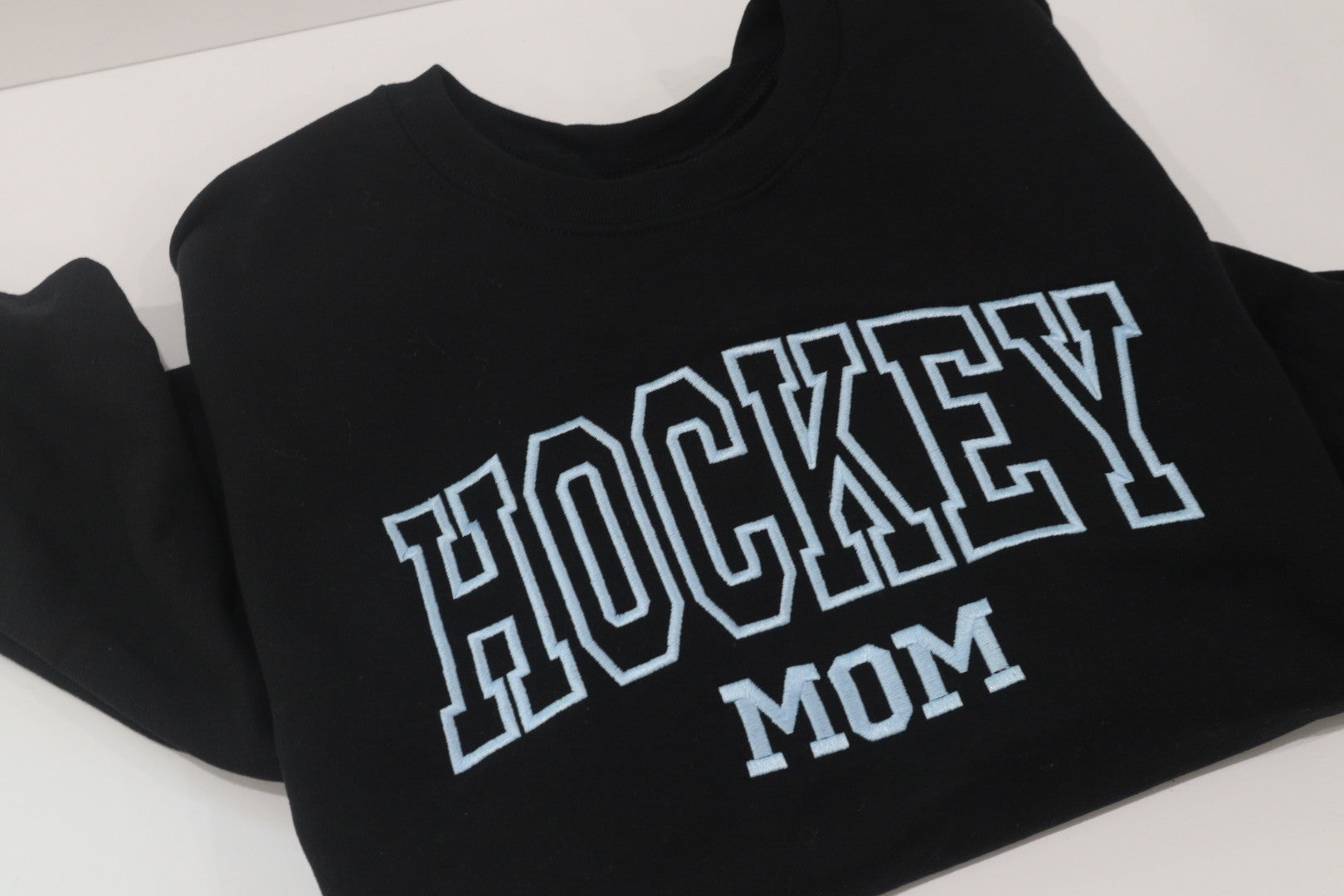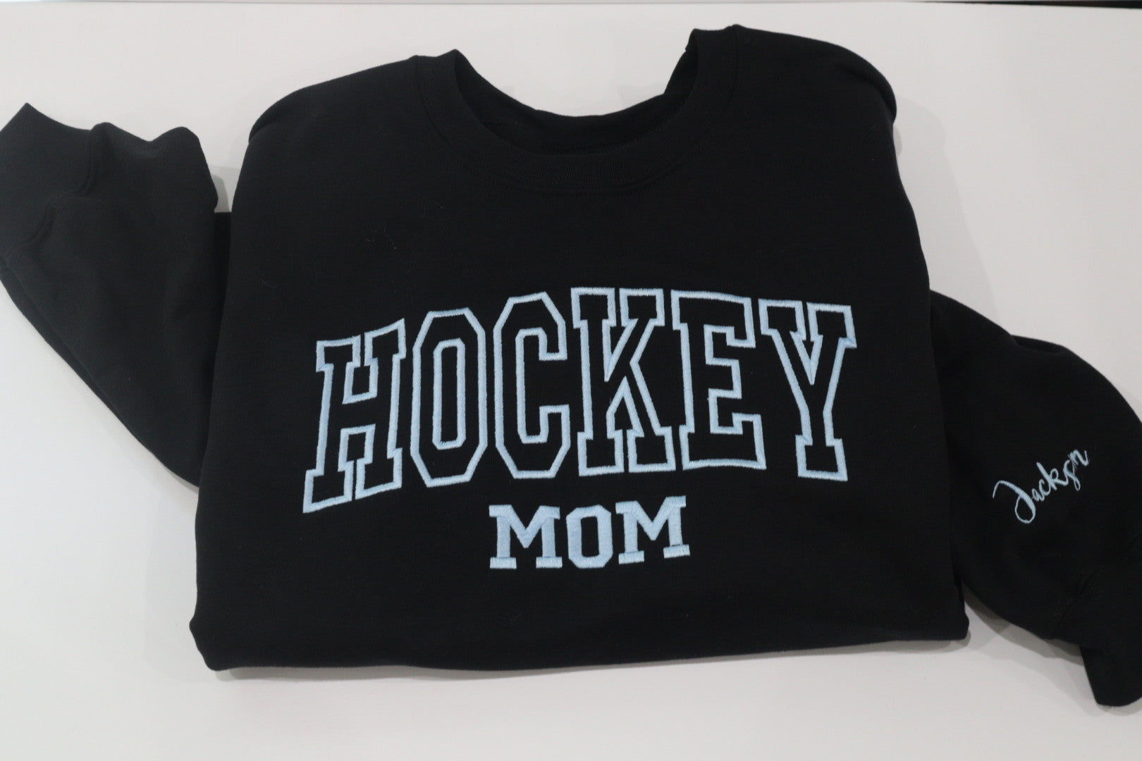 Black crewneck with baby blue thread unless specified, can pick any thread color!
